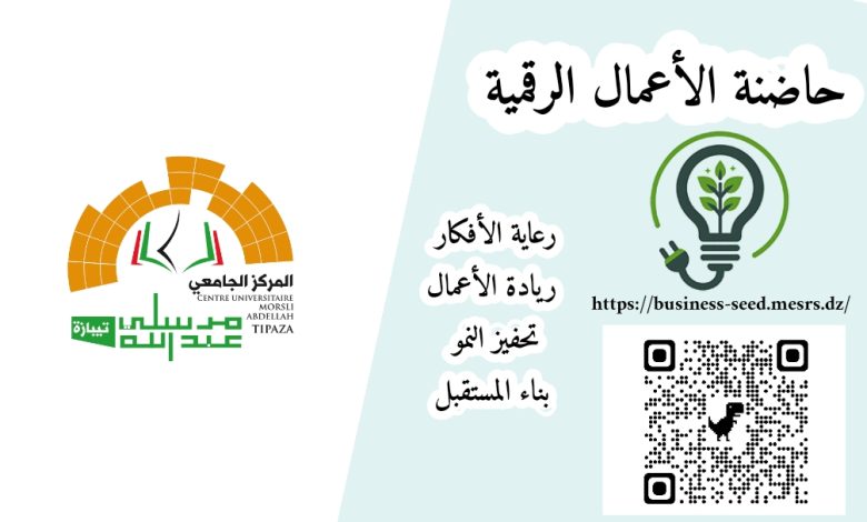 رابط حاضنة الأعمال الرقمية، الأولى وطنياًّ و مغاربياًّ https://business-seed.mesrs.dz/ أو عبر مسح الرابط :