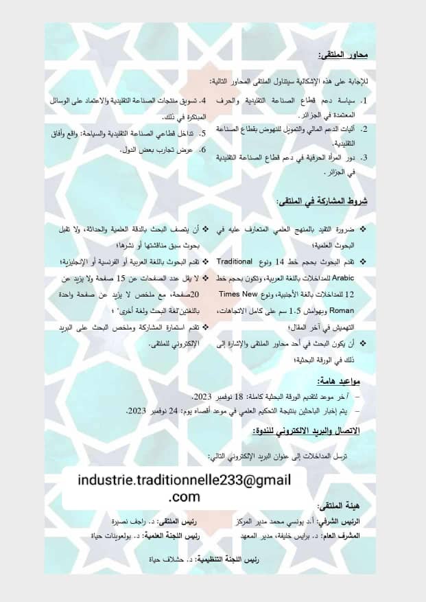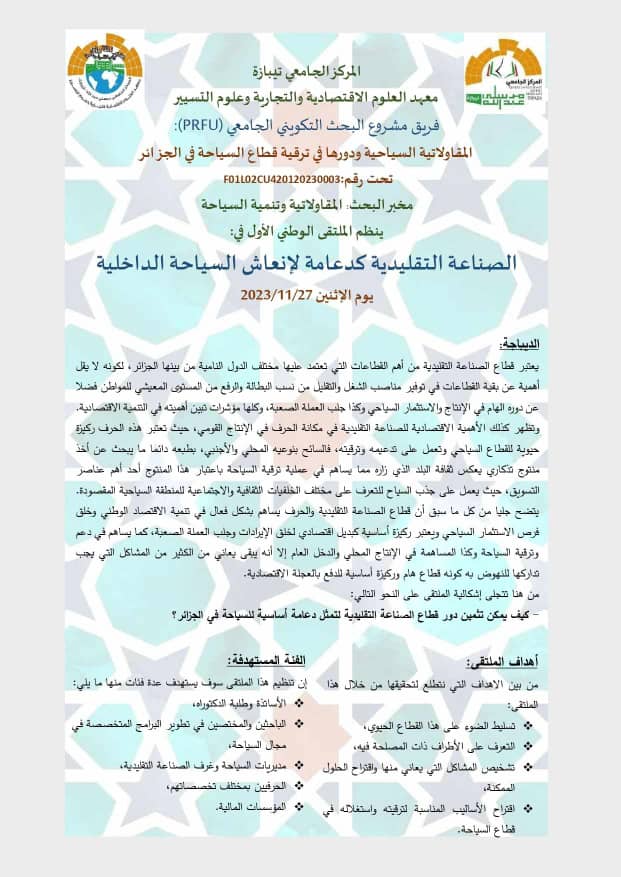 مخبر البحث المقاولاتية و تنمية السياحة ينظم الملتقى الوطني الأول في: ” الصناعة التقليدية كدعامة لإنعاش السياحة الداخلية ” يوم الإثنين 2023/11/27