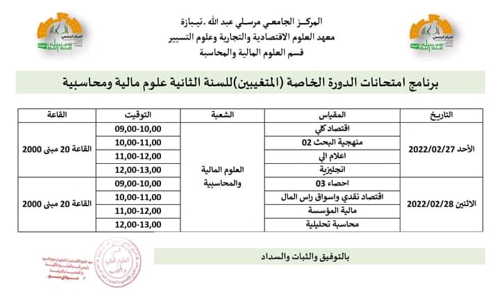 برنامج امتحانات الدورة الخاصة ( المتغيبين) للسنة الثانية علوم مالية و محاسبية
