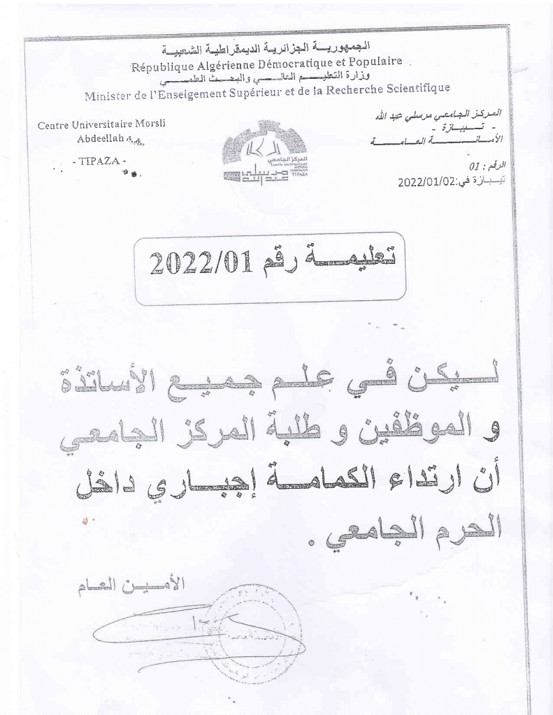 ليكن في علم جميع الأساتذة و الموظفين و طلبة المركز الجامعي أن ارتداء الكمامة إجباري داخل الحرم الجامعي .
