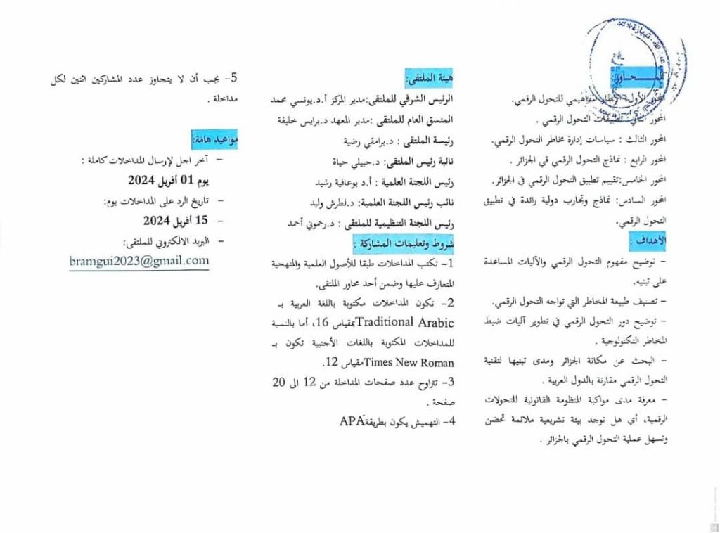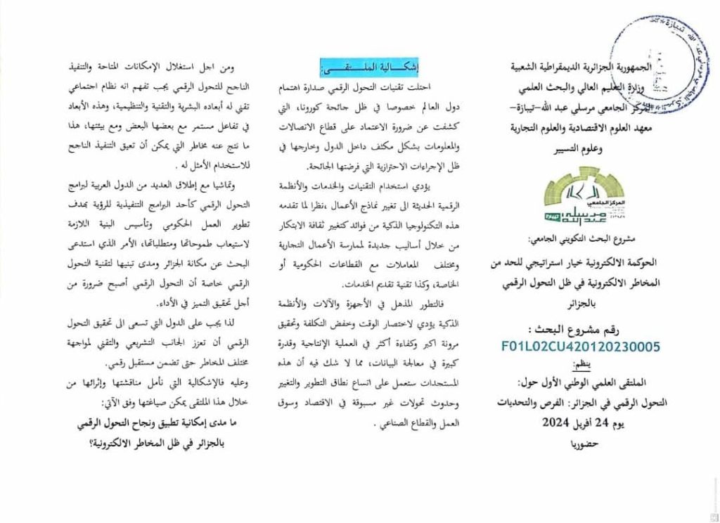 ملتقى العلمي الوطني الأول حول : ” التحول الرقمي في الجزائر : الفرص و التحديات”