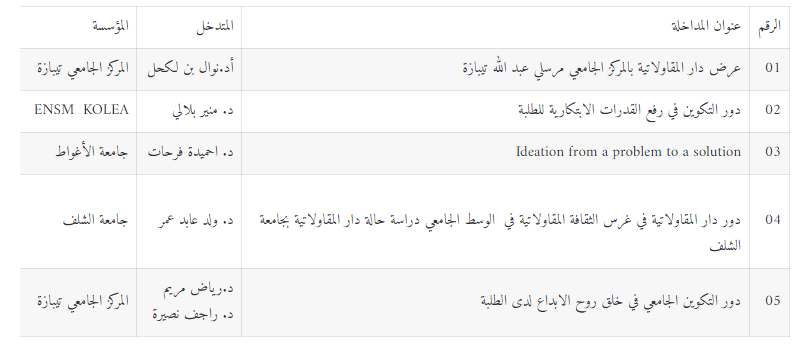 أي نشاط تعليمي فردي كان أو جماعي، يفضل استخدام الصفات والمواقف التي تعبر عن إرادة مقاولاتية. يهدف التدريب والتكوين التكميلي، الموجود في جميع البرامج الجامعية، إلى جعل الطالب يحتك بمجالات المعرفة الأخرى غير تلك التي يحتويها البرنامج الدراسي. سنحاول من هذا الملتقىالإجابة على هذا التساؤل من خلال عرض تجربة دور المقاولتية بالجامعات الجزائرية